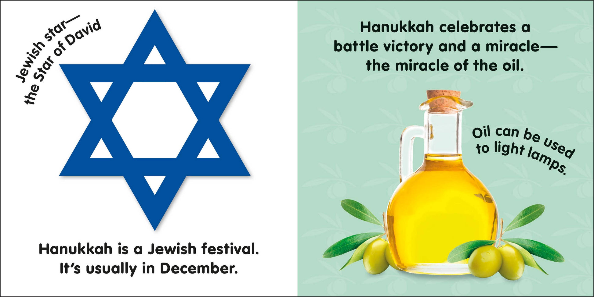 Perfect for storytime with babies and toddlers over the Jewish holiday period, this first-board book introduces Hanukkah traditions and festivities. From the miracle of the oil, lighting the menorah candles, and delicious fried latkes and doughnut treats, to the spin-the-top dreidel game, shiny chocolate coins, and fun family time with songs to sing and gifts to give and receive, all the elements of this wonderful Jewish festival of lights are included. This classic little picture book has simple language and engaging, real-life photos that bring the warmth and celebrations of Hanukkah to life. With one main image per page to focus on, the book is clear and easy for babies and toddlers to follow, and the short text is enjoyable to read aloud and share with young children. Specially made for little hands, this hard-wearing board book has a soft padded cover and safe rounded corners.
