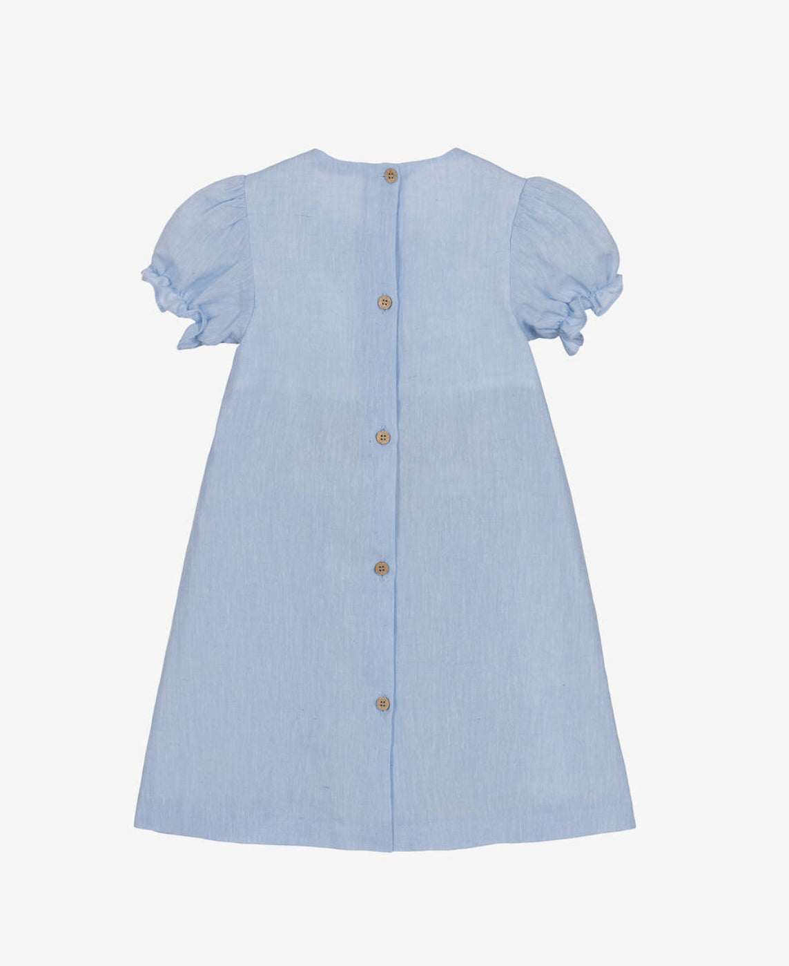 Pretty blue dress for girls by Spanish brand Babidu, made in soft cotton. Lightweight and comfortable to wear, it has a beautifully smocked bodice in red with a cotton voile partial lining for modesty. The sweet puff sleeves are gently elasticated and there are wooden button fastenings on the back, for a classic look.