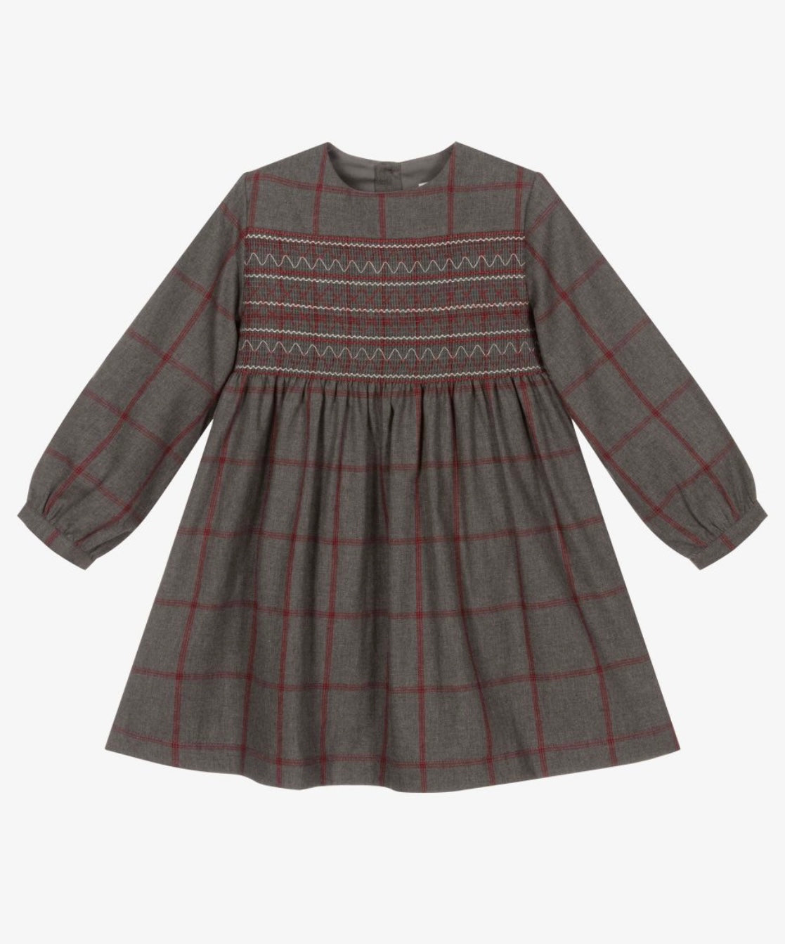 Lovely grey dress for girls by Laranjinha, with red and white embroidered smocking across the bodice. Made and lined in cotton, it has red checks and fastens with pretty mother-of-pearl logo buttons on the back.