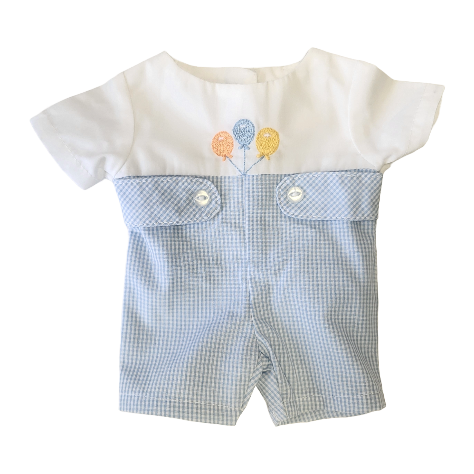 A sweet little puppy dog friend with a stylish Birthday romper who is ready to celebrate! This hand-knit dog doll comes with an adorable short sleeve pastel blue check romper with embroidered Birthday balloons for some added flair. This cotton knit dog doll makes the perfect friend for celebrating a Birthday and can become a treasure keepsake to remember the big day!