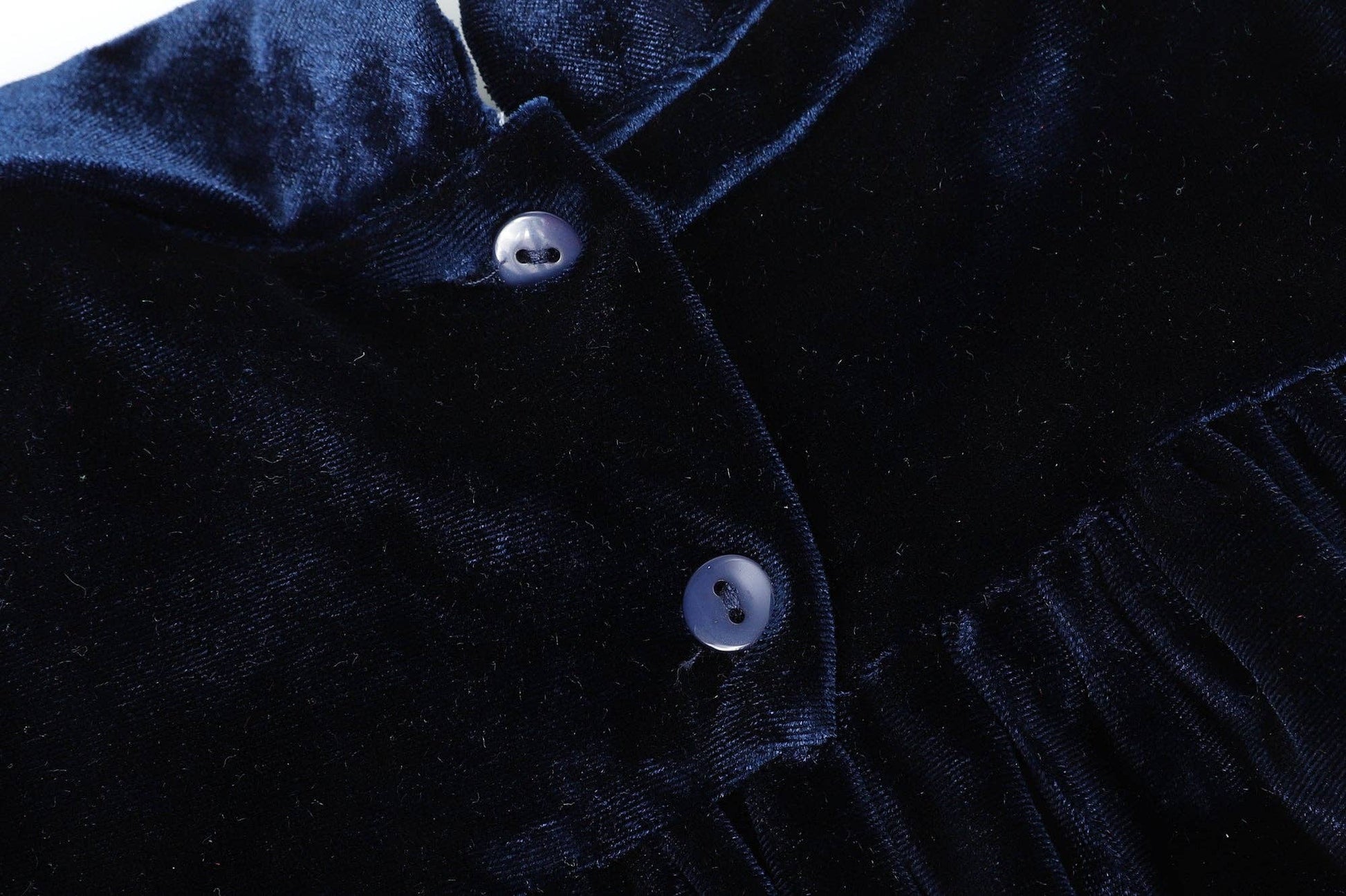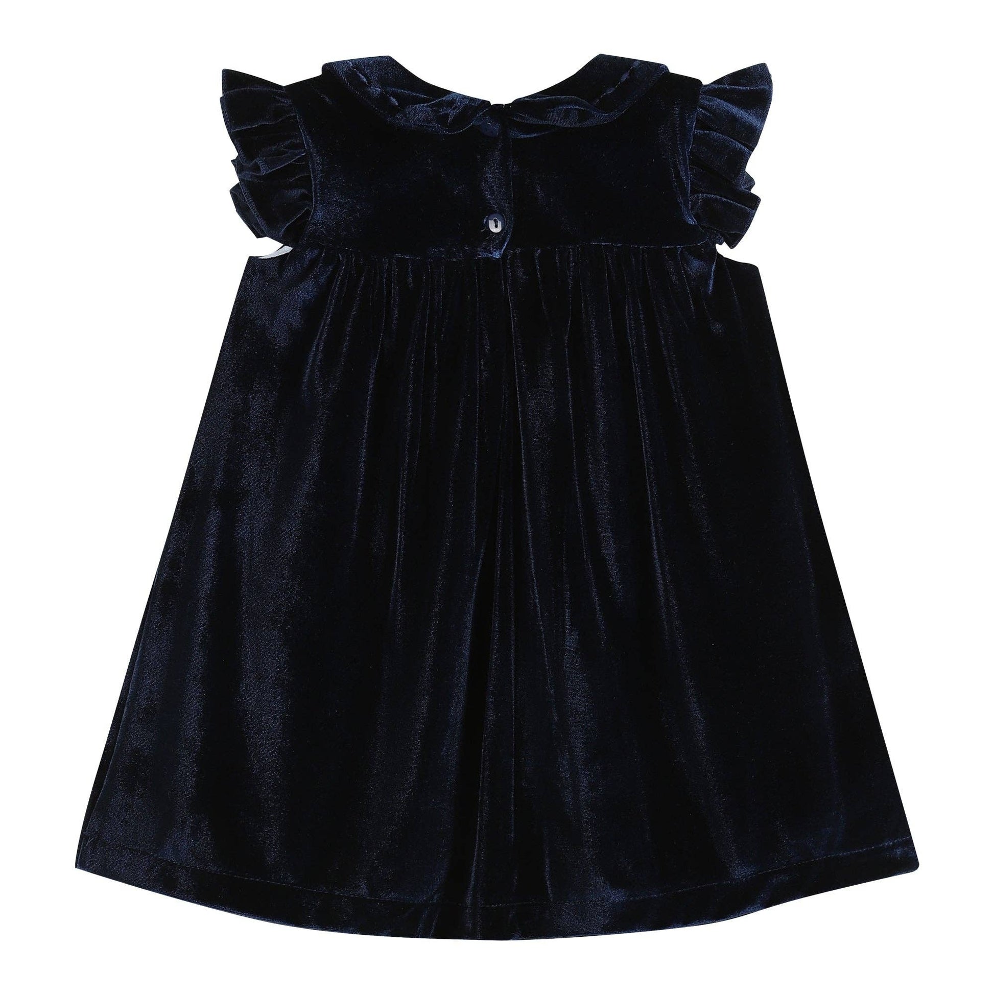 Stunning and Sweet! This beautiful navy blue velvet dress features cute ruffle details, and flutter sleeves. A stunning outfit for your cutie and all of her winter wonderland fun. From twirling and dancing the day away to holiday parties with family; no matter the occasion she will be looking picture-perfect!