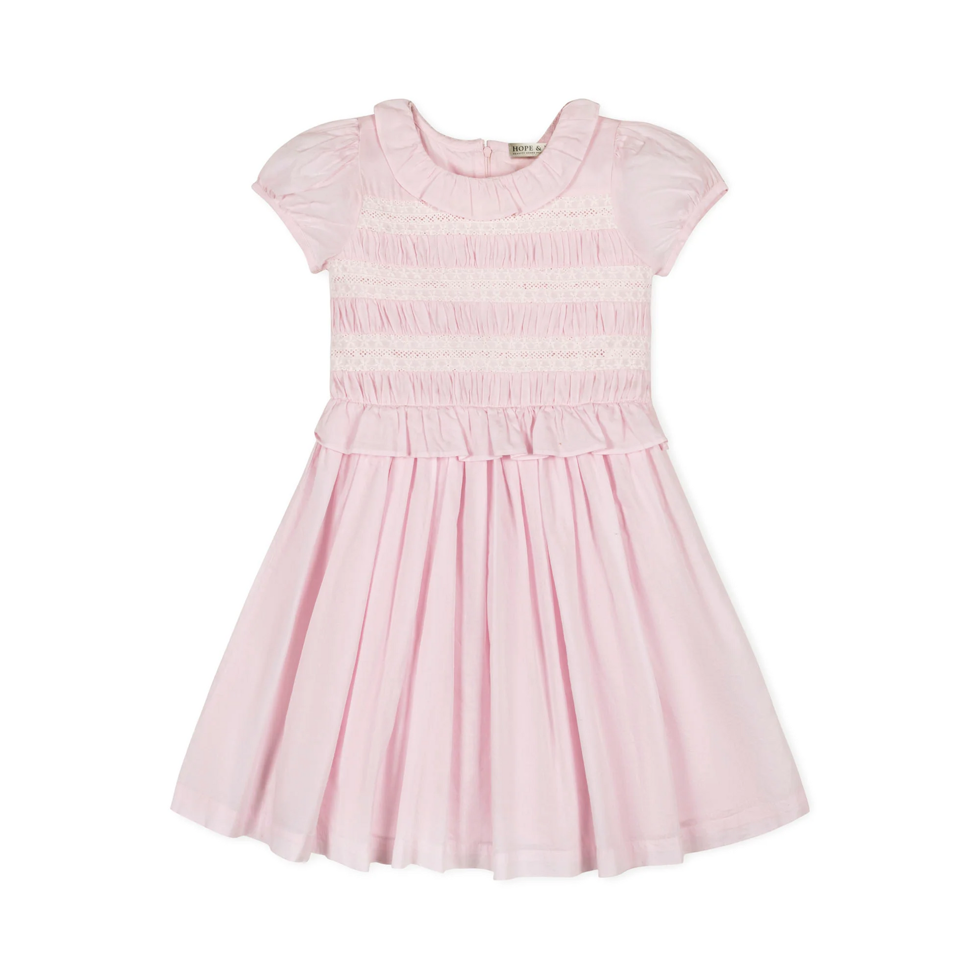 Our beautiful dress in soft organic cotton features an adorable ruffle collar to frame her face with simple charm. Features a stretchy smocked bodice with crochet trim detail, puff sleeves, and ruffles at the collar and waist. Fully lined in cotton with a zipper at the center back. Ready to shine at all of her special occasions.