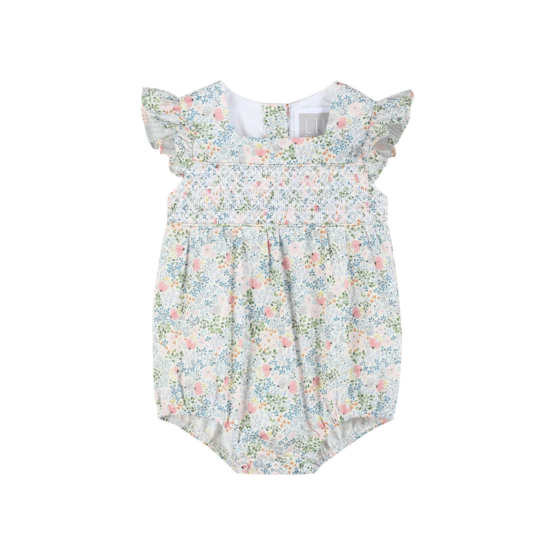 This darling romper is blooming with charm! Made from soft, breathable cotton, it features a delicate pink floral print, smocked detailing across the chest, and sweet flutter sleeves for a timeless, feminine touch. With convenient snaps at the bottom for easy diaper changes and a comfortable fit, this romper is perfect for warm-weather outings, special occasions, or everyday play. A lovely choice for baby girls who are ready to shine in style!