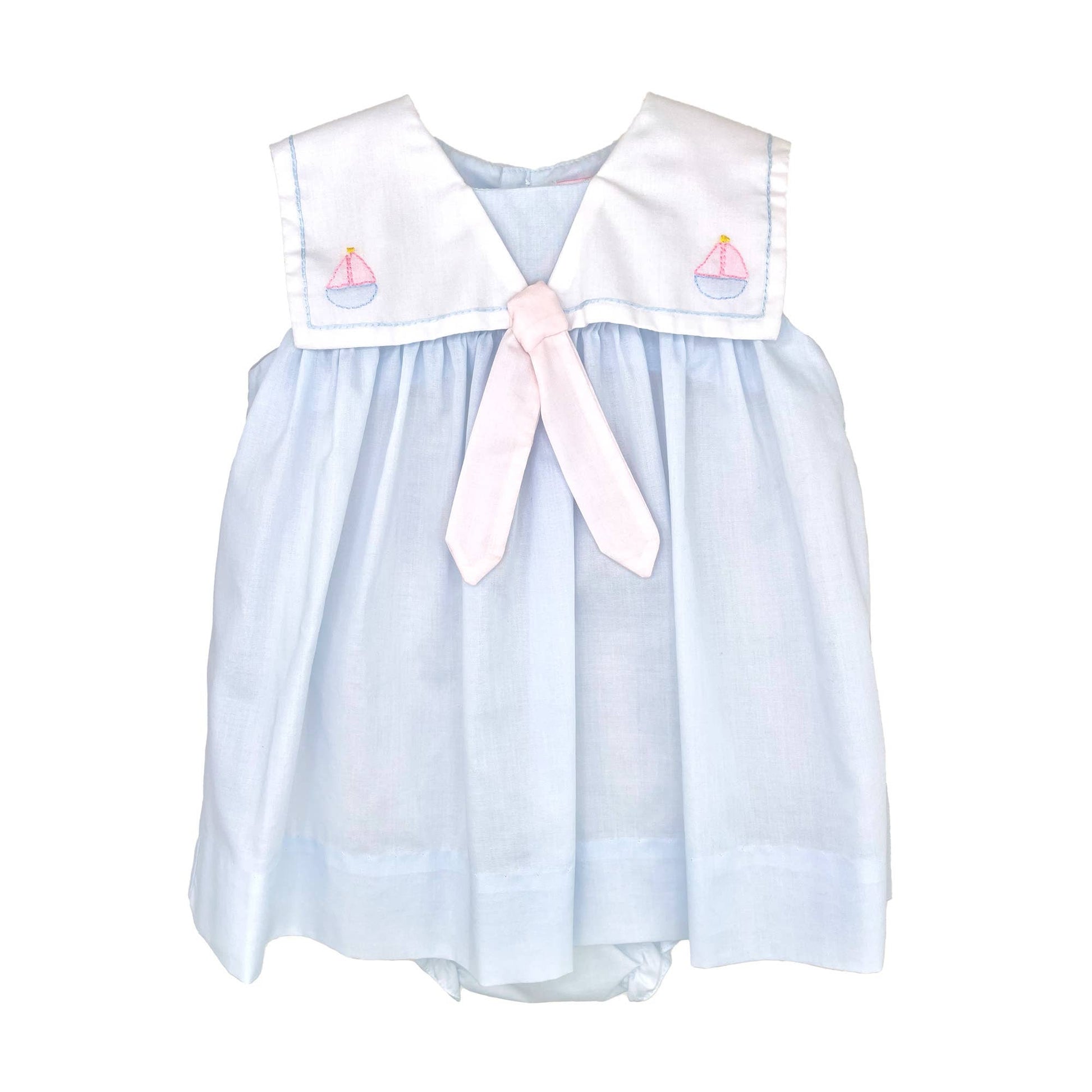 A fun and playful dress that is perfect for summertime with an embroidered sailboat and nautical style collar. Featuring heirloom-quality handcrafted details like shadow stitch embroidery this outfit is truly one of a kind.