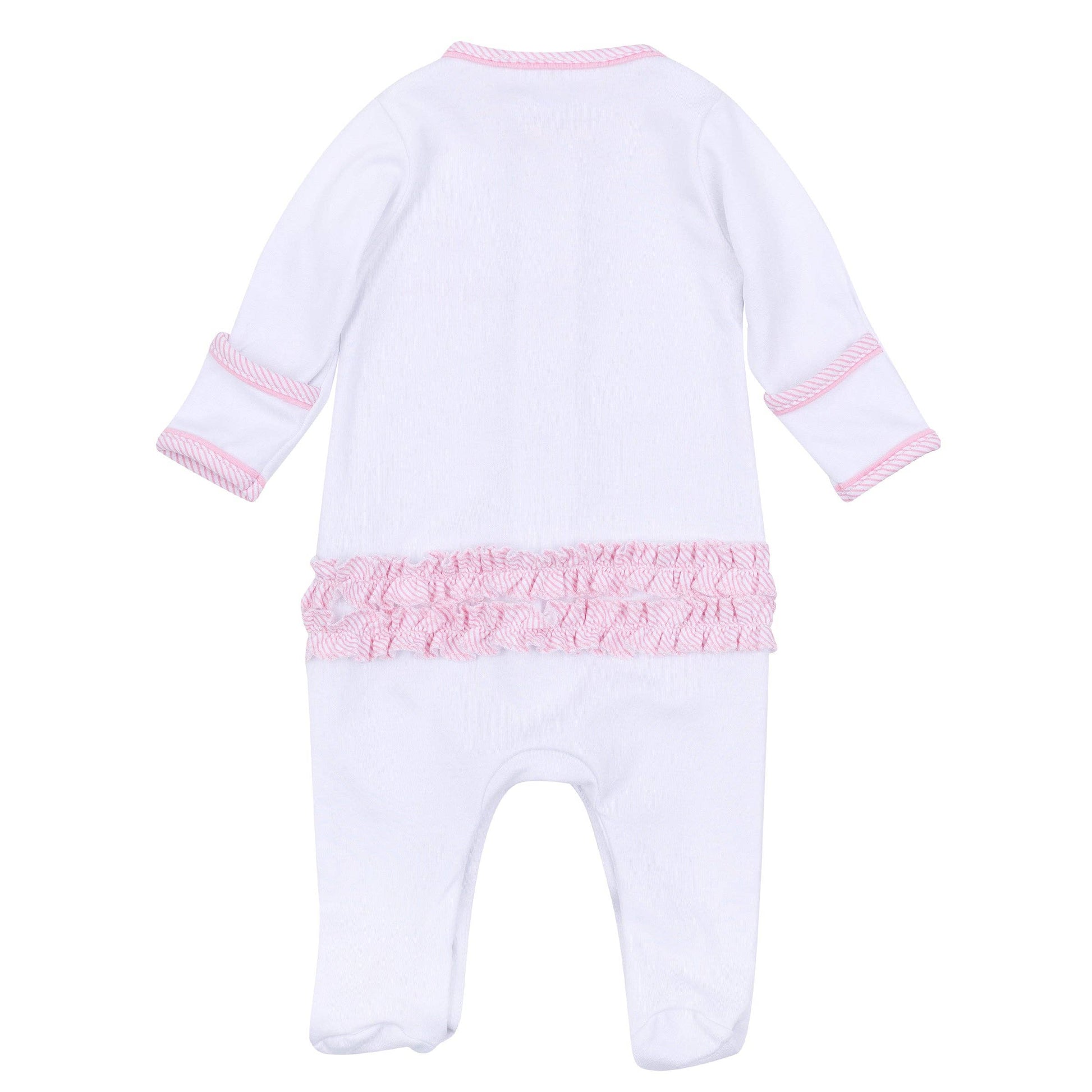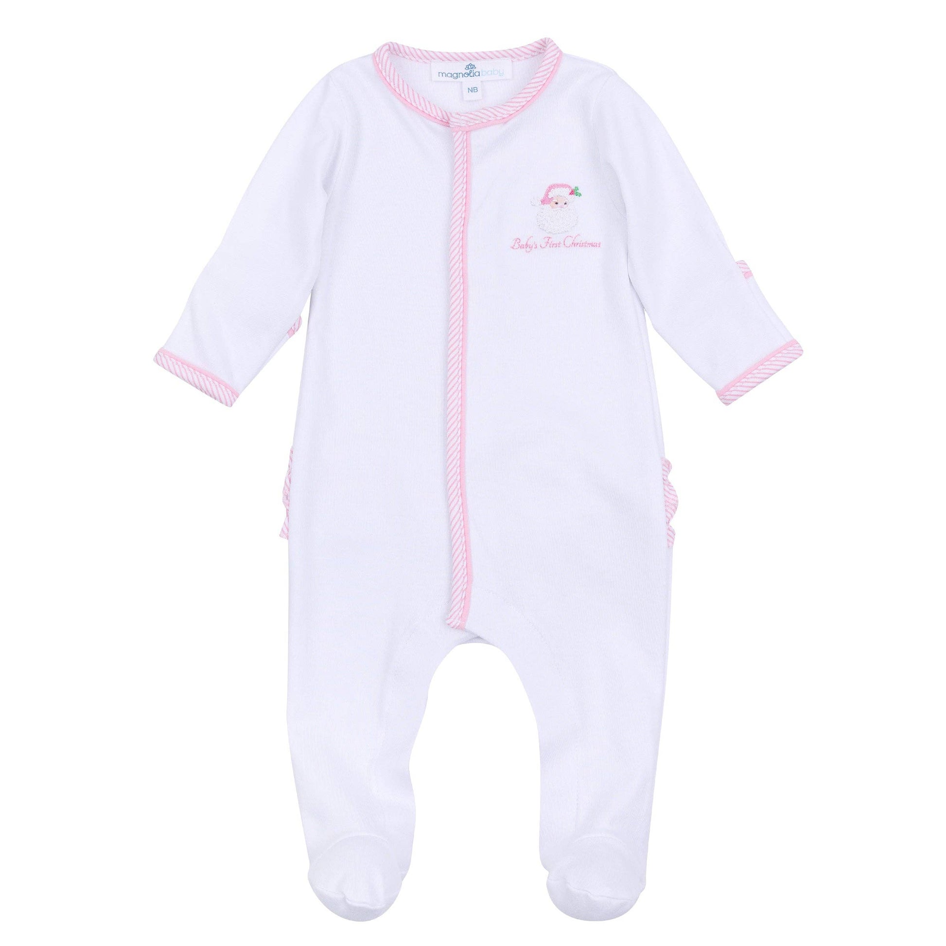 Celebrate a special milestone with our Santa Baby Embroidered Baby's First Christmas Footie - Pink or Blue. Inspired by the joyful spirit of Santa Claus, this charming white footie, crafted from luxurious Pima Cotton, features festive embroidery. Features: * 100% Pima Cotton: This luxurious and soft fabric is gentle on your baby's delicate skin. * Snap Closures: Convenient snaps from neck to feet allow for quick and easy dressing and diaper changes. * Hand-Embroidered ""Baby's First Christmas"": A special keepsake detail to cherish this holiday milestone. * Delicate Ruffles: Ruffles along the snap placket, neckline, and cuffs add a touch of sweet charm.