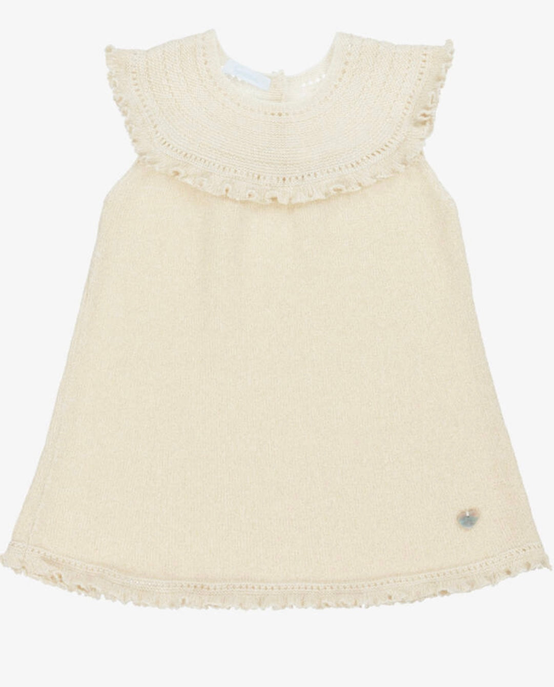 Girls gold knitted dress by Artesanía Granlei, crafted from a soft cotton blend and interwoven with shimmering gold threads. This sleeveless dress features a delicate frilled trim along the bodice and hemline, adding a touch of charm. Button fastenings on the back ensure easy dressing. Perfect for spring or summer occasions, this dress offers a blend of elegance and comfort. Limited quantities available, making it a special addition to any wardrobe