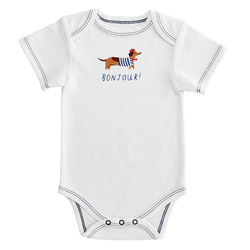 Add a French-inspired flair to your little one's wardrobe with this charming Bonjour snapshirt featuring an adorable dog design. Made of easy-care soft cotton spandex with convenient snap closures for easy diaper changes.